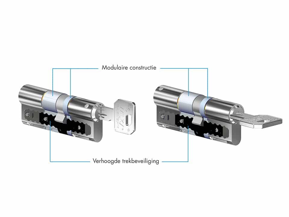 Met slechts 4 verschillende brugdelen en behuizingsverlengstukken kan de cilinder met behulp van het modulaire systeem van WILKA op de gewenste lengte worden omgebouwd. De basislengte van 30/30 mm kan aan beide zijden in stappen van 5 mm worden verlengd tot een cilinderlengte van 90/90 mm. Een modulaire brug van roestvast staal biedt extra bescherming tegen het gewelddadig afbreken en kerntrekken van de cilinder.